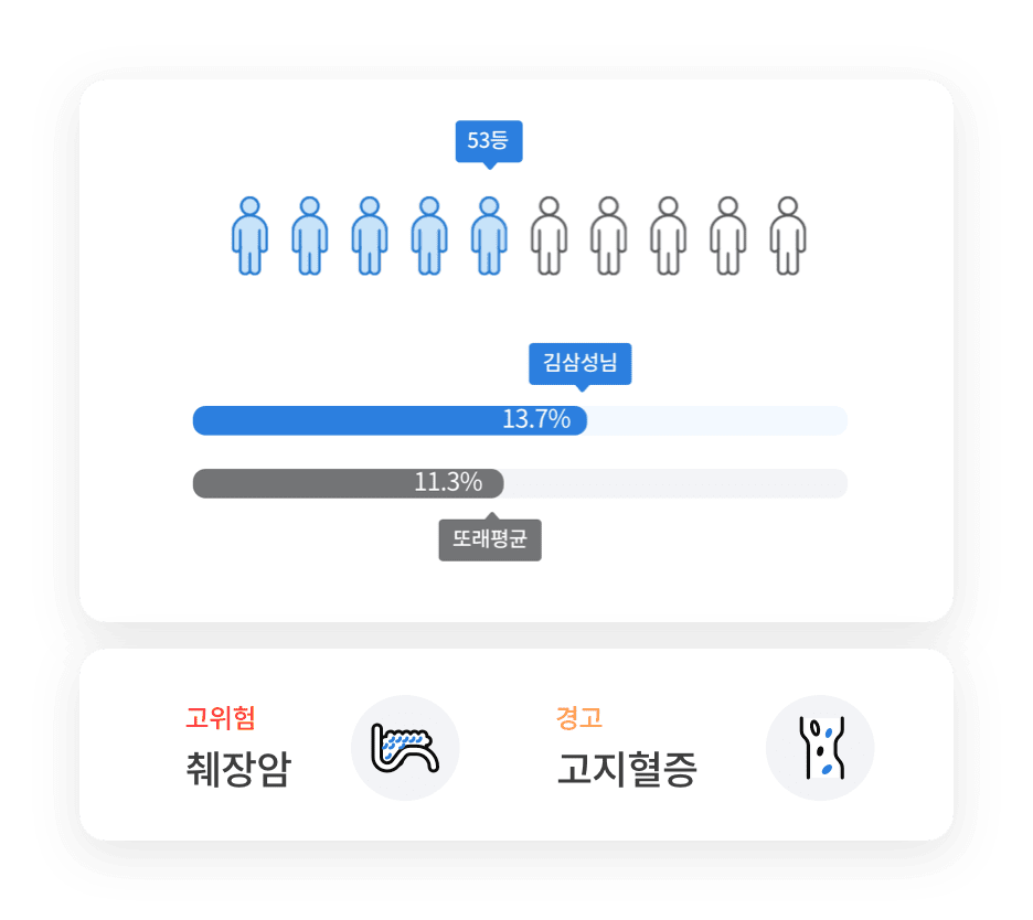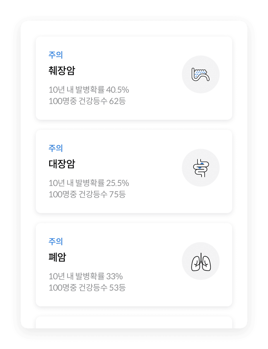 18개 주요 질환에 대한 설명, 건강 등수 및 향후 발병 위험도를 확인해 보세요
